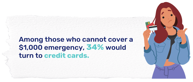 - Among those who cannot cover a $1,000 emergency, 34% would turn to credit cards.