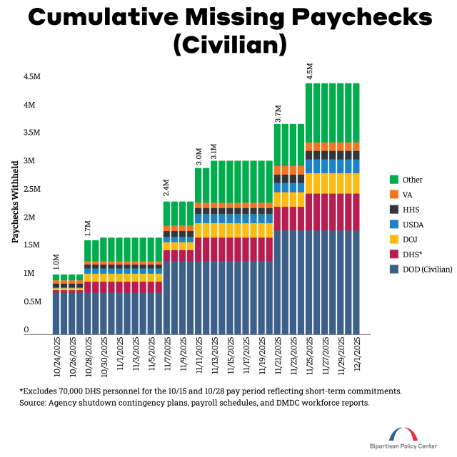 Since October 1, approximately 1.4 million federal workers have missed paychecks. They received their last partial paychecks on October 10 and then missed their first full paycheck on October 24. While Congress has guaranteed back pay once agencies reopen, that doesn’t help families facing bills today.