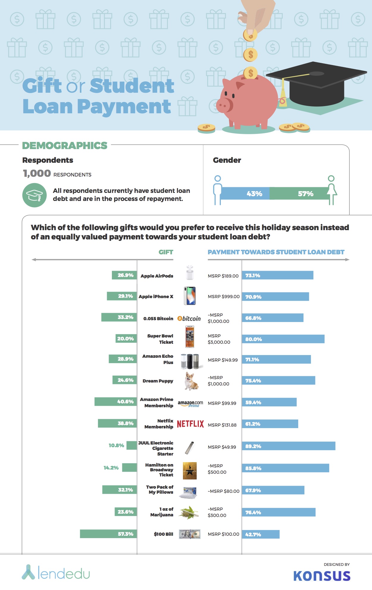 The only traditional holiday gift that was more coveted than the student loan payment was a $100 bill. Maybe the poll participants intended to just put that $100 towards their student loan balance, which would be an easier process than say, reselling an iPhone X and putting the proceeds towards their debt.
