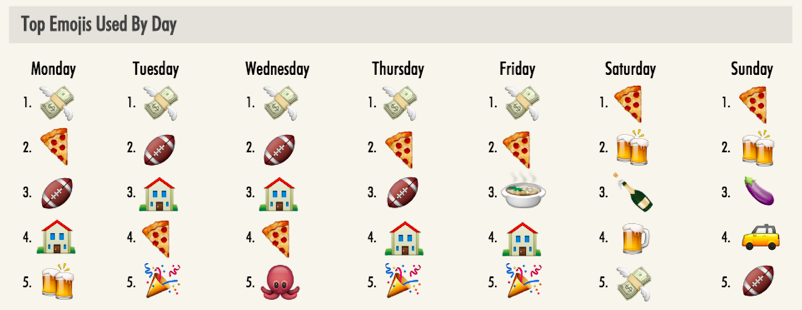 Pizza is the clear winner here. The money with wings, and the house emoji, are largely used for rent and bills. Drinking, eating, and traveling emojis are very popular on the app.
