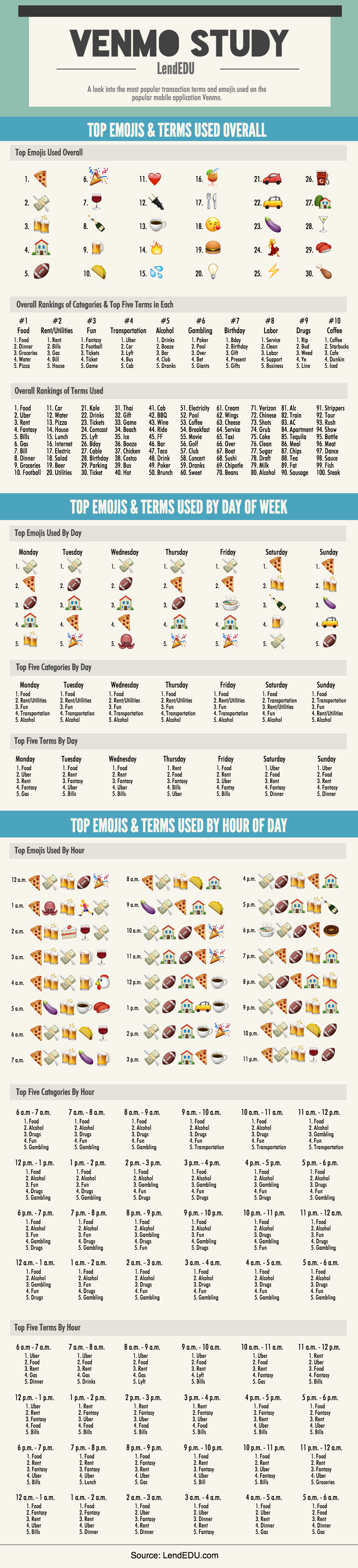 Venmo users are usually young and tech-savvy. And, Emojis are extremely popular in the app. In our study, we analyzed more than 500,000 transactions to find out which emojis, terms, and categories are the most popular uses for Venmo. We studied a few other interesting things too. Enjoy!